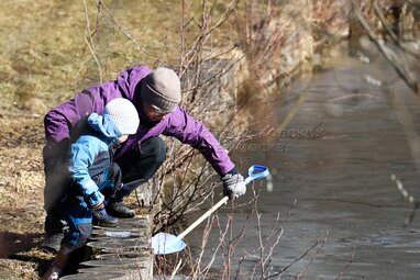 Мама с ребенком во время прогулки у воды. Весенние городские жанры.
