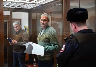 Экс-замглавы министерства обороны РФ Тимур Иванов (в центре) и его бывший подчиненный Антон Филатов (слева), обвиняемые по делу о растрате и выводе более 4 млрд руб. из банка «Интеркоммерц», на заседании в Мосгорсуде.