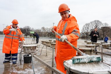 Промывка светомузыкального фонтана в Парке Горького в рамках подготовки к весенне-летнему сезону.