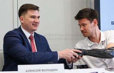 Заместитель руководителя Департамента труда и социальной защиты населения города Москвы Алексей Володин (слева) и амбассадор компании «Метиз» Алексей Транцев. Презентация новой линейки бионических протезов кистей на Международной специализированной выставке и конгрессе по реабилитации, уходу, физиотерапии, протезированию и ортопедии, мобильности и социальной инклюзии «Интеграция-2025» в «Тимирязев центре».
