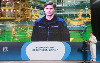 Российские космонавты Алексей Овчинин, Иван Вагнер и Кирилл Песков, находящиеся на Международной космической станции (МКС). Всероссийский космический диктант под руководством летчика-космонавта Федора Юрчихина в центре «Космонавтика и авиация» на ВДНХ.