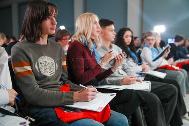 Летчик-космонавт Российской Федерации, Герой России, президент Центра «Космонавтика и авиация» на ВДНХ Федор Юрчихин с участниками Всероссийского космического диктанта в центре «Космонавтика и авиация» на ВДНХ.
