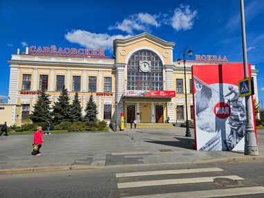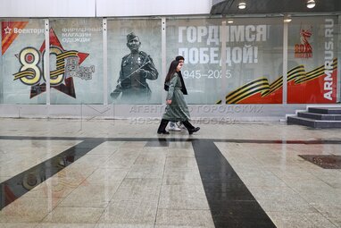 Баннер на станции метро «Новомосковская». Оформление Москвы ко Дню Победы.