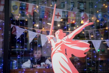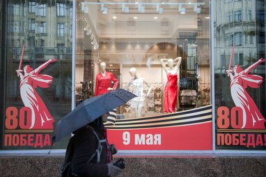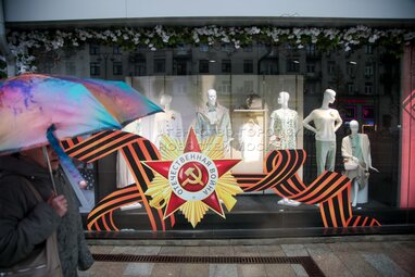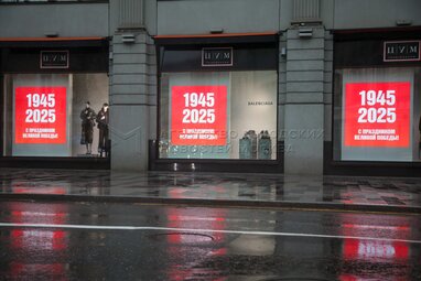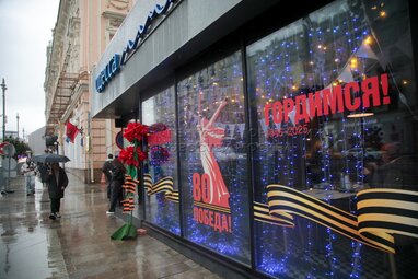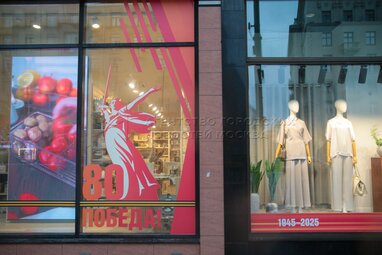 Украшение ко Дню Победы на витринах магазинов. Оформление Москвы ко Дню Победы.