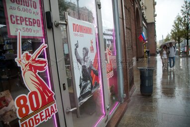 Плакат на витрине магазина. Оформление Москвы ко Дню Победы.