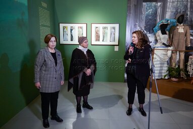 Заместитель директора по науке Государственного историко-художественного и литературного Музея-заповедника «Абрамцево» Елена Митрофанова, директор Государственного историко-художественного и литературного Музея-заповедника «Абрамцево» Елена Воронина и директор Государственного центрального музея кино Лариса Баженова (слева направо). Открытие выставки «Дворянское гнездо. Иннокентию Смоктуновскому посвящается» в Музее кино в павильоне №36 на ВДНХ.