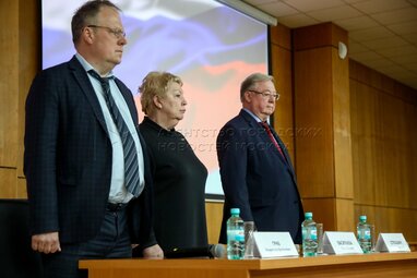 Сопредседатель Общенациональной премии «Учебник года» – председатель РПС, заместитель секретаря Общественной палаты РФ, заслуженный юрист РФ, академик РАО Владислав Гриб, президент Российского университета дружбы народов (РУДН) Владимир Филиппов и ректор Московского инженерно-физического института (МИФИ) Михаил Стриханов (слева направо на втором плане). Церемония награждения победителей общенациональной премии и одноименного конкурса Российского профессорского собрания «Учебник года» в Российской академии образования.