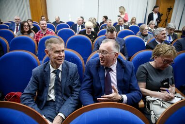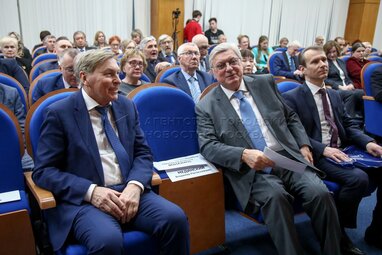 Президент Российского университета дружбы народов (РУДН) Владимир Филиппов (слева) и ректор Московского государственного института международных отношений (МГИМО) Анатолий Торкунов (в центре). Церемония награждения победителей общенациональной премии и одноименного конкурса Российского профессорского собрания «Учебник года» в Российской академии образования.