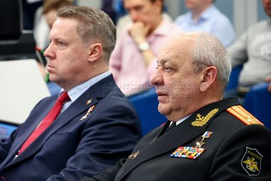 Герой России, первый заместитель председателя правления Клуба Героев Советского Союза, Героев РФ и полных кавалеров ордена Славы Москвы и Московской области Вячеслав Сивко (слева) и председатель Мосгордумы Алексей Шапошников. Пресс-конференция, посвященная запуску проекта «Города-герои – города героев».