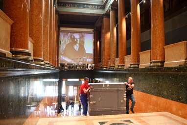 Монтаж выставки «Подвиг музея», совместного проекта Государственного музея изобразительных искусств (ГМИИ) имени Пушкина и Государственного Русского музея в главном здании ГМИИ.