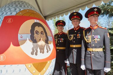 Иерей, старший священник храма Живоначальной Троицы в Свиблово отец Димитрий (слева), председатель Мосгордумы Алексей Шапошников (второй справа на заднем плане) и директор Детской художественной школы имени Серова, праправнучка Валентина Серова Александра Серова (справа) во время церемонии награждения победителей конкурса росписи Пасхальных яиц на фестивале «Пасхальный дар», который проходит на прихрамовых территориях храма Троицы Живоначальной в Свиблово в день Светлой Пасхи.