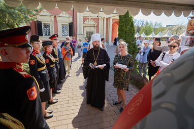 Настоятель храма Живоначальной Троицы в Свиблово митрополит Звенигородский Арсений и директор Детской художественной школы имени Серова, праправнучка Валентина Серова Александра Серова (в центре) во время подведения итогов конкурса росписи Пасхальных яиц на фестивале «Пасхальный дар», который проходит на прихрамовых территориях храма Троицы Живоначальной в Свиблово в день Светлой Пасхи.