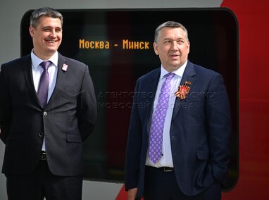 Член комиссии Мосгордумы по транспорту и развитию дорожно-транспортной инфраструктуры, заместитель начальника Московской железной дороги (по территориальному управлению) Петр Потапов (справа). Запуск международного поезда «Ласточка» сообщением Москва – Минск, оформленного к 80-летию Победы, с Белорусского вокзала.