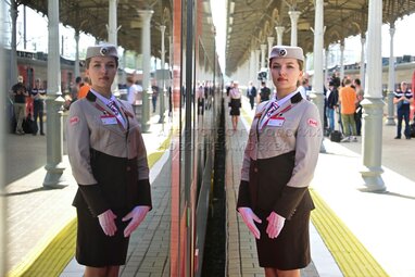 Проводник Юлия. Запуск международного поезда «Ласточка» сообщением Москва – Минск, оформленного к 80-летию Победы, с Белорусского вокзала.