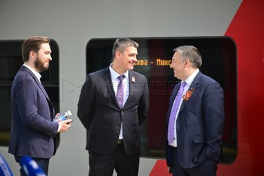 Директор АО «Федеральная пассажирская компания» (АО «ФПК») Владимир Пястолов (справа по центру). Запуск международного поезда «Ласточка» сообщением Москва – Минск, оформленного к 80-летию Победы, с Белорусского вокзала.