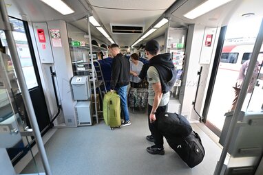 Надпись «посадки нет». Запуск международного поезда «Ласточка» сообщением Москва – Минск, оформленного к 80-летию Победы, с Белорусского вокзала.