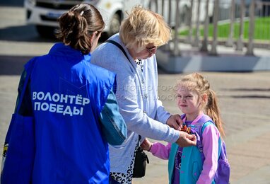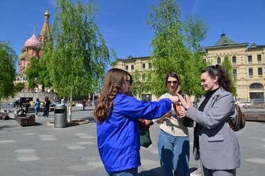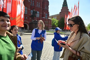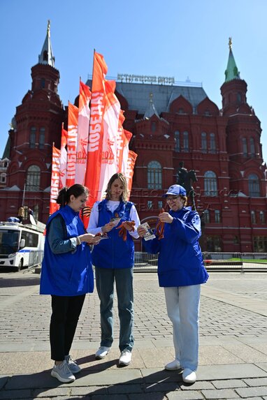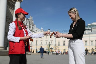 Председатель комитета общественных связей и молодежной политики города Москвы Екатерина Драгунова. «Волонтеры Победы» в первый день международной акции «Георгиевская ленточка» в преддверии Дня Победы.
