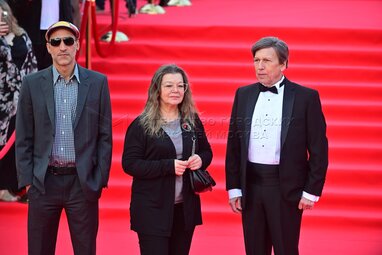 Жюри конкурса «Русские премьеры», режиссеры – Владимир Грамматиков, Анна Матисон и продюсер Сергей Титинков (слева направо). Церемония закрытия 47-го Московского международного кинофестиваля (ММКФ) в кинотеатре «Россия» на Пушкинской площади.