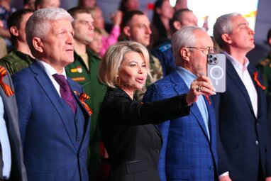 Общественный уполномоченный по вопросам разработки и внедрения инженерных решений Алексей Кучмин, полковник ВС РФ, Герой Российской Федерации, заместитель командующего ракетными войсками и артиллерией Московского военного округа Аркадий Корольков и сопредседатель общественного совета партпроекта «Историческая память» Наталия Мельяновская. Международная патриотическая акция «Диктант Победы» в национальном центре «Россия».