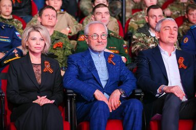 Полковник ВС РФ, Герой Российской Федерации, заместитель командующего ракетными войсками и артиллерией Московского военного округа Аркадий Корольков, сопредседатель общественного совета партпроекта «Историческая память» Наталия Мельяновская и художественный руководитель Театра сатиры, депутат Мосгордумы Евгений Герасимов (слева направо). Международная патриотическая акция «Диктант Победы» в национальном центре «Россия».