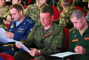 Военный комиссар Замоскворецкого района города Москвы Алексей Буянов, общественный уполномоченный по вопросам разработки и внедрения инженерных решений Алексей Кучмин и полковник ВС РФ, Герой РФ, заместитель командующего ракетными войсками и артиллерией Московского военного округа Аркадий Корольков (слева направо). Международная патриотическая акция «Диктант Победы» в национальном центре «Россия».