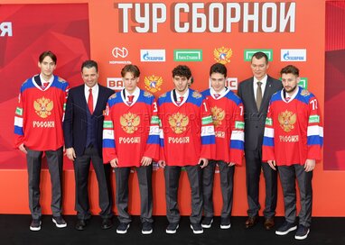 Министр спорта РФ Михаил Дегтярев (в центре). День открытых дверей хоккейной сборной «Россия 25» в рамках подготовки к «Лига Ставок Туру Сборной» в учебно-тренировочном центре «Новогорск» в Химках.