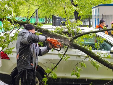Последствия падения деревьев на автомобили во дворах из-за мокрого снега в Москве.