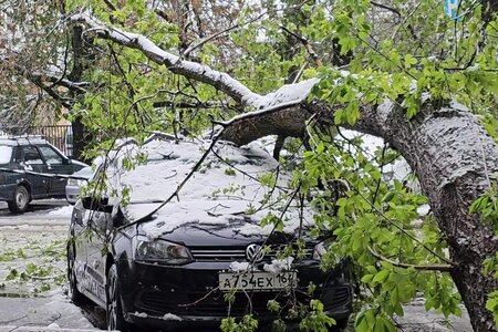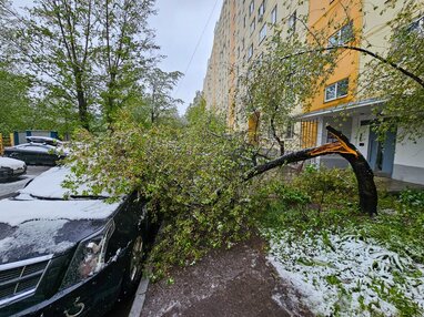 Последствия падения деревьев на автомобили во дворах из-за мокрого снега в Москве