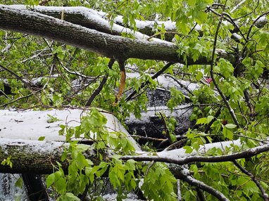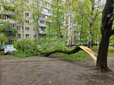 Последствия падения деревьев на автомобили из-за мокрого снега во дворе д. 9 на ул. Мусоргского.