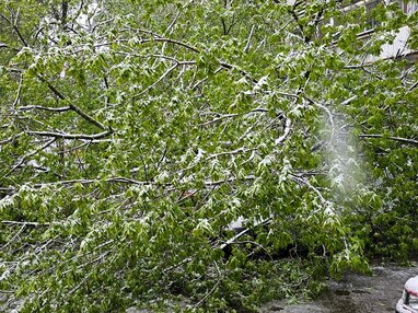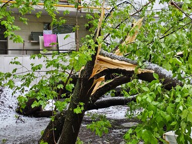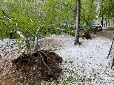 Последствия падения деревьев на автомобили из-за мокрого снега во дворе д. 18 на Алтуфьевском шоссе.