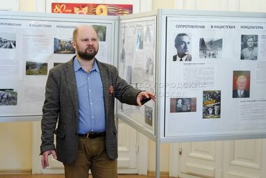 Руководитель поискового проекта «Солдатские обелиски» Московского авиационного института (МАИ), кандидат исторических наук, полковник запаса Александр Грибовский. Открытие историко-документальной выставки «Непокоренные: сопротивление в нацистских концлагерях» в Свято-Димитриевском училище сестер милосердия на Ленинском проспекте.