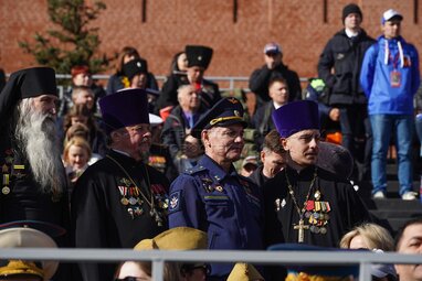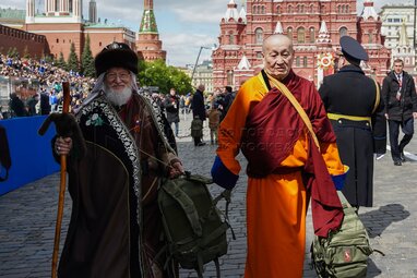 Верховный муфтий России и председатель Центрального духовного управления мусульман России Талгат Таджуддин (слева) и XXIV Пандито Хамбо лама – глава Буддийской традиционной сангхи России Дамба Аюшеев. Парад в честь 80-й годовщины Победы в Великой Отечественной войне на Красной площади.