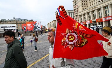 Мужчина со знаменем Победы на Театральной площади во время празднования 80-й годовщины Победы в Великой Отечественной войне.