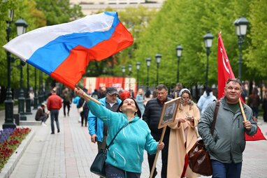 Мужчина с флагом на Тверской улице во время празднования 80-й годовщины Победы в Великой Отечественной войне.