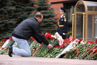 Цветы у Вечного огня в Александровском саду во время празднования 80-й годовщины Победы в Великой Отечественной войне.
