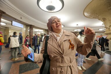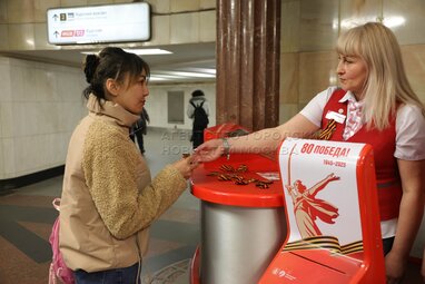 Раздача Георгиевских лент и сувениров пассажирам на стойках «Живое общение». Празднование Дня Победы в аванзале станции «Курская».