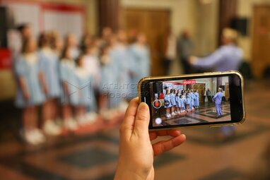 Исполнение Всероссийским детским новым хором песен военных лет. Празднование Дня Победы в аванзале станции «Курская».