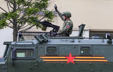 Колонны военной техники возвращаются после парада Победы на Красной площади.