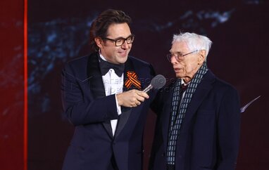 Народный артист РСФСР Сергей Шакуров (слева) и художественный руководитель театра «Современник» и Театра Олега Табакова Владимир Машков (справа). Концерт Великой Победы под руководством народного артиста СССР, Героя труда РФ Юрия Башмета в парке «Зарядье».