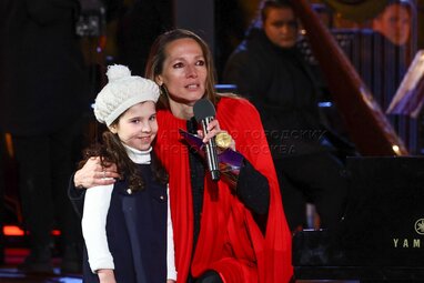 Ведущая тележурналист ВГТРК Дарья Златопольская и юная пианистка Дарья Сорокина. Концерт Великой Победы под руководством народного артиста СССР, Героя труда РФ Юрия Башмета в парке «Зарядье».