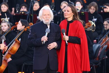 Ведущая тележурналист ВГТРК Дарья Златопольская и актер Станислав Любшин. Концерт Великой Победы под руководством народного артиста СССР, Героя труда РФ Юрия Башмета в парке «Зарядье».