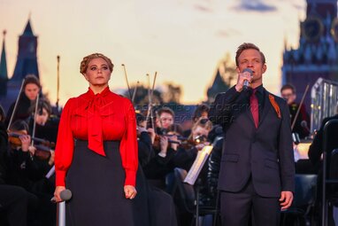 Ведущие тележурналисты ВГТРК Дарья Златопольская и Андрей Малахов. Концерт Великой Победы под руководством народного артиста СССР, Героя труда РФ Юрия Башмета в парке «Зарядье».