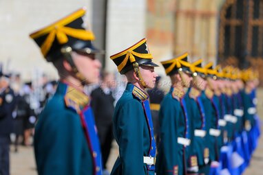 Вынос Государственного флага РФ, флага ФСО, знамени кадетских классов и флага Юнармии. Церемония приведения к торжественной клятве учащихся кадетских и юнармейских классов Федеральной службы охраны РФ (ФСО) на Соборной площади Московского Кремля.