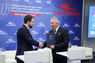 Подписание соглашения между Федеральным агентством воздушного транспорта и Ассоциацией вертолетной индустрии на Международной выставке вертолетной индустрии и беспилотных авиационных систем HeliRussia-2025 в международном выставочном центре «Крокус Экспо».