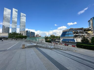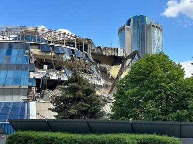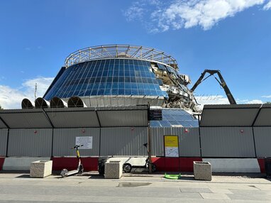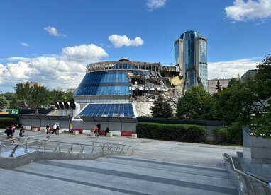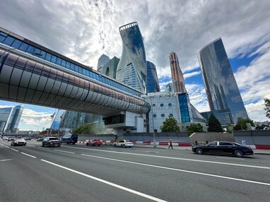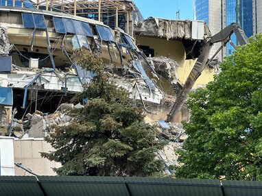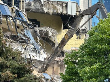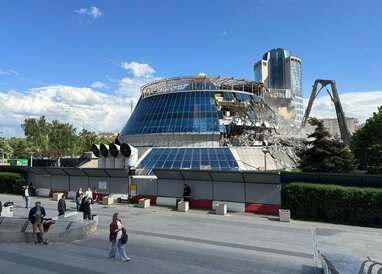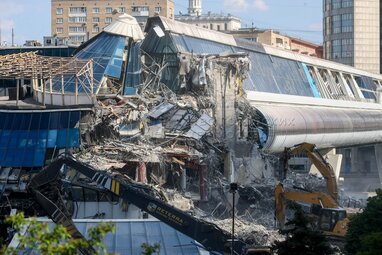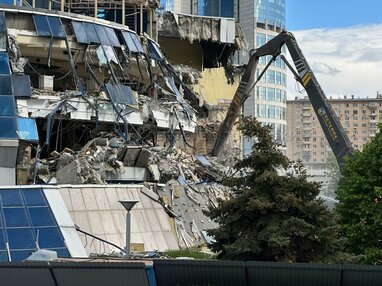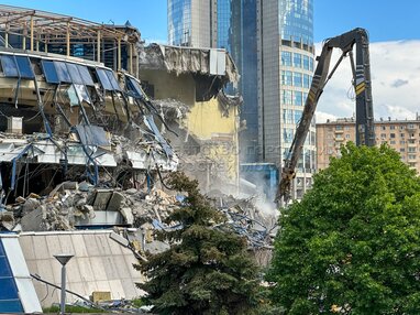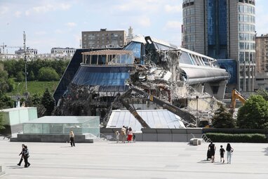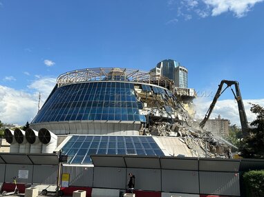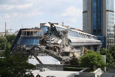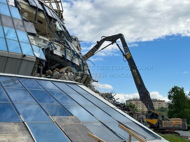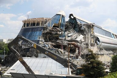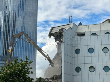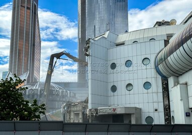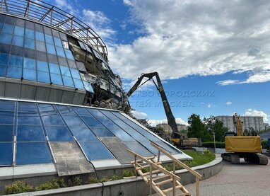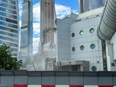 Демонтаж северного вестибюля пешеходного моста «Багратион» возле Московского международного делового центра «Москва-Сити».