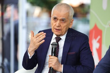 Академик РАН, заместитель президента Российской академии образования Геннадий Онищенко (слева). Посетители и участники XI Книжного фестиваля «Красная площадь» в Москве.