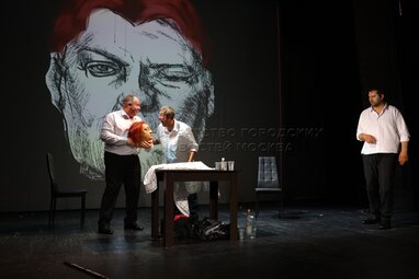 Актеры Михаил Парыгин (на первом плане) и Артем Ткаченко. Премьера театральной постановки «Голова Джармуша».