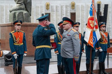 Глава МЧС России Александр Куренков на церемонии вручения ордена Почета ФГКУ «Специальное управление ФПС №3 МЧС России» в Зале Славы Музея Победы.