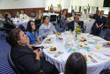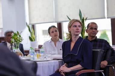 Директор Культурного центра имени Джавахарлала Неру при посольстве Индии в Москве Мадхур Канкана Рой (слева на втором плане). Пресс-встреча в посольстве Индии в Москве, посвященная XI Международному дню йоги, который пройдет 21 июня 2025 года на площадке у Мичуринского сада на ВДНХ.