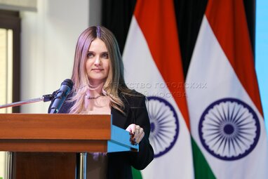 Начальник управления международного взаимодействия комитета по туризму города Москвы Регина Глейм. Пресс-встреча в посольстве Индии в Москве, посвященная XI Международному дню йоги, который пройдет 21 июня 2025 года на площадке у Мичуринского сада на ВДНХ.